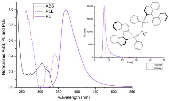 Normalized absorption (ABS, CH2Cl2 solution, r.t.), emission (PL, solid, r.t., λexcitation = 260 nm), and excitation (PLE, solid, r.t., λemission = 410 nm) spectra of (S,S)-[ZnBr2{O=PPh(BINOL)}2] at room temperature. Luminescence decay curve (solid, r.t., λexcitation = 373 nm, λemission = 410 nm) of (S,S)-[ZnBr2{O=PPh(BINOL)}2].