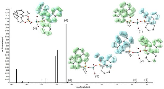 Dichloromethane solutions of the two enantiomers of [ZnBr2{O=PPh(BINOL)}2] absorb radiation for wavelengths below 340 nm, as observable, for instance, in Figure 3. SOC-corrected TD-DFT calculations at the C-PCM/r2SCAN-3c level (dichloromethane as a continuous medium) predict the most intense absorption at 358 nm, with an underestimation of the energy of around 5%. According to the hole-electron distribution [42], the absorption appears to be essentially related to the presence of the BINOL fragment, and the same consideration is also valid for further bands predicted at longer wavelengths, between 359 and 385 nm, with much lower intensities. In all cases, the participation of triplet configurations is negligible. As observable in Figure 4, the character of the transition changes from ligand-centered for the main absorption to interligand charge transfer for the bands predicted at lower energy.