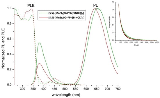 Normalized emission (PL, solid, r.t., λexcitation = 310 nm, solid lines) and excitation (PLE, solid, r.t., λemission = 650 nm, dotted lines) spectra of (S,S)-[MnX2{O=PPh(BINOL)}2] (X = Cl, Br) at room temperature. Luminescence decay curves (solid, r.t., λexcitation = 290 nm, λemission = 640 nm) of (S,S)-[MnX2{O=PPh(BINOL)}2] (X = Cl, Br).