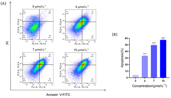 Cells were seeded in a 6-well plate and cultured for 24 h. The old culture medium was then removed and different concentrations of drugs in media were added, followed by incubation for 48 or 72 h. The cells were then digested with trypsin without EDTA, collected, and centrifuged. The supernatant was decanted, and PBS was added to clean the cells twice. We then added 500 µL of binding buffer per well to the resuspended cells, followed by 5 µL of Annexin. V-FITC and 5 µL PI were then gently mixed and incubated at room temperature in the dark for 5–15 min. Finally, the sample was analyzed with flow cytometry. The results were quantified with Flow Jo software (v 10.8.1).