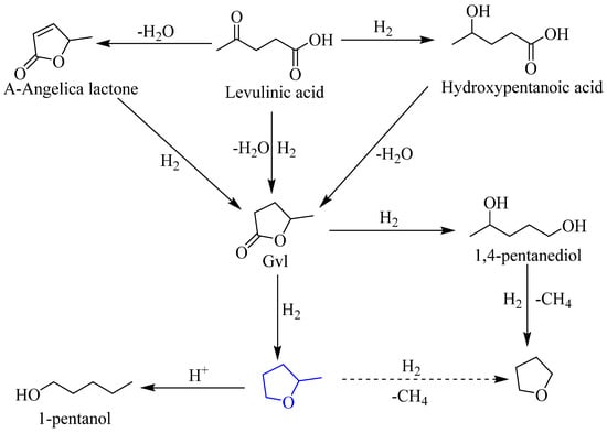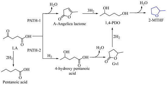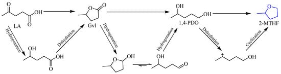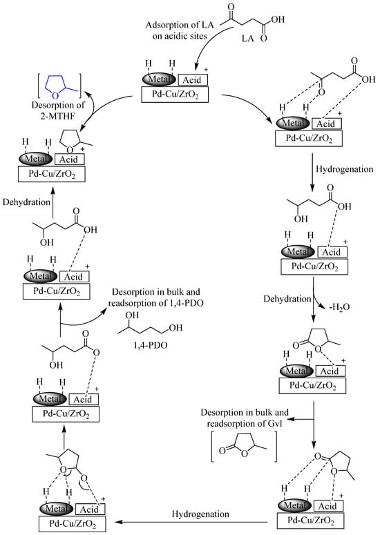 Synthesis Mechanism of Gvl, 1,4-PDO, and 2-MTHF from LA using a Pd-Cu/ZrO2 Catalyst. Scheme adopted from [98].