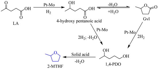 One-pot transformation of LA to 2-MTHF over Pt−Mo/H-β. Scheme adopted from [99].
