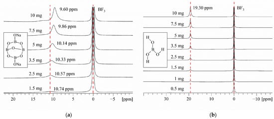 Figure 1. (a) 11B NMR shifts of dissolving 10 mg, 7.5 mg, 5 mg, 3.5 mg, 2.5 mg, and 1.5 mg of borax in 0.5 mL D2O; (b) 11B NMR shifts of dissolving 10 mg, 7.5 mg, 5 mg, 3.5 mg, 2.5 mg, 1.5 mg, 1 mg and 0.5 mg of boric acid in 0.5 mL D2O. The reference signal of BF3 at δ = 0.00 ppm is shown.