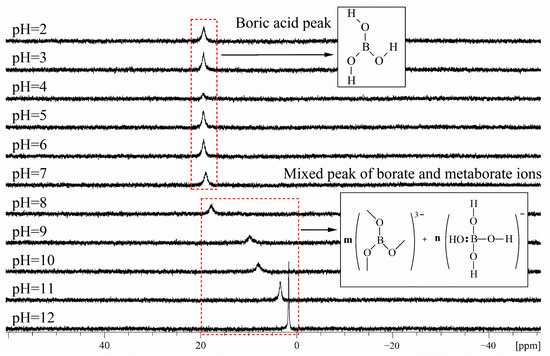Borax undergoes a certain degree of coordination reaction in aqueous solution, and some SP2 hybridized boron atoms will transform into SP3 hybridized boron atoms due to the coordination reaction. In acidic environments (pH < 7), the elemental form of boron can be determined as the uncoordinated SP2 hybridized boron atom form, i.e., borate ions. In the process of gradually adjusting the solution environment to alkaline, more and more boron forms coordination bonds with a pair of electrons in OH due to the formation of empty orbitals, which are hybridized from SP2 to SP3, and the spatial configuration is transformed from a planar triangle to a spatial tetrahedron. As the number of SP3 hybridized boron atoms increases, the 11B NMR signal of the aqueous solution gradually shifts towards a higher field. When the pH was adjusted to 12, δB reached 1.63 ppm, at which point the boron atoms in the aqueous solution mainly existed in the form of SP3 hybridization. At this point, borate ions were transformed into metaborate ions, which is consistent with Park et al. [38], and corresponds to the 11B NMR signal of sodium metaborate measurement of δB = 1.3 ± 0.5 ppm.