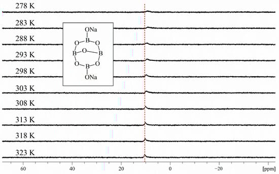 Figure 3 shows 11B NMR spectra of borax solutions at 278 K, 283 K, 288 K, 293 K, 298 K, 303 K, 308 K, 313 K, 318 K, and 323 K. The boron concentration of each solution was 0.052 M. Considering that TCM containing borax is mostly taken by patients at room temperature, an 11B NMR study was conducted in an environment of 278 K–323 K. Unlike the 11B NMR study of borax solutions at varying pHs, according to Figure 3, it can be seen that the effect of temperature on the 11B NMR spectrum of borax solutions is not significant and can be ignored.