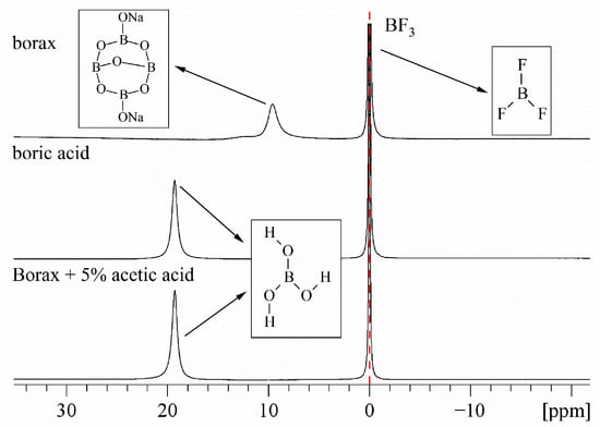 Figure 4 shows 11B NMR spectra of borax, boric acid, and borax + 5% acetic acid samples. The reaction is rapid and the generation of boric acid is stable. Borax and acetic acid stably generate boric acid in an aqueous solution, and the boric acid peak is detected by 11B NMR. After 8h, the boric acid peak is still determined.