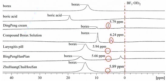 We discuss five of these TCMs preparations, from No.7 to 11, in Table 2, and their 11B NMR-superimposed spectra with boric acid and borax are shown in Figure 5. The query in the TCM prescription database revealed that the main boron-containing TCM added to these five boron-containing TCMs was borax, and in the NMR-superimposed spectra of 11B in Figure 5, the raw material borax peak was detected in all the other four TCMs except the Ice boron tablets and the similar peak in Ice boron tablets was shifted to δB = 15.4 ppm in the lower field, which was beyond the range of δB 9.80–13.09 ppm defined for borax in the previous part of our experiments. This may be the effect of the concentration or pH [33].