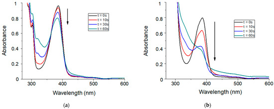 Steady-state photolysis in chloroform during 60 s of irradiation under LED@405 nm (100 mW/cm2) of (a) TXS alone and (b) TXS/Iod photoinitiating system. [TXS] = 4.3 × 10−3 mol/L, and [Iod] = 8.6 × 10−3 mol/L.