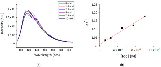 (a) Fluorescence emission spectra of TXS in CHCl3 with the gradual addition of Iod and (b) The Stern–Volmer plot describing the fluorescence quenching of 1TXS by Iod. λexcitation at 385 nm.