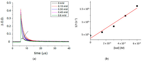 (a) Quenching of the transient absorption triplet state of TXS by an increasing concentration of Iod at 640 nm, and (b) the Stern–Volmer plot of 3TXS quenching by Iod. Laser excitation at λ355 nm.