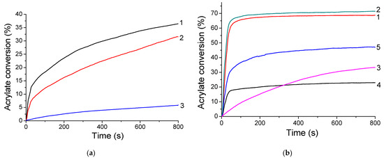 Kinetic profiles of the FRP of (a) MAPTMS and (b) MAPTMS 25 wt%/SOA 75 wt% blend mixtures using TXS/Iod (0.5%/2% w/w) as the photo-initiating system in laminate and under LED@385 nm (1), LED@405 nm (2), and LED@455 nm (3) after 800 s of irradiation. Photopolymerization under air: curve 4 = irradiation under LED@385 nm and curve 5 = irradiation under LED@405 nm.