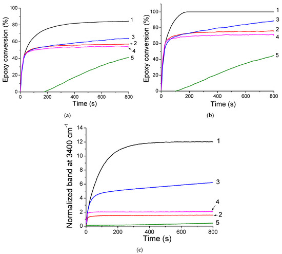 Evolution of the epoxy conversions of (a) DPDO and (b) GPTMS in the DPDO/GPTMS mixture, and (c) hydrolysis extent vs. irradiation time of GPTMS 25 wt%/DPDO 75 wt% formulation with TXS/Iod (1%/2% w/w) at LED@385 nm (1) under air, (2) in laminate at LED@405 nm, and (3) under air, (4) in laminate, and (5) at LED@455 nm under air.