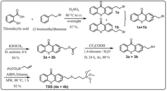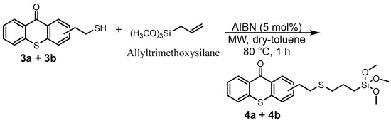 The introduced bromide group was converted into a thioester function with an 84% yield just by reacting with potassium thioacetate. The resulting TX thioester, 2a/2b, was subjected to an acidic hydrolysis leading to a thiolated thioxanthone as a mixture of two regioisomers (3a/3b) with an 80% yield. Due to the presence of two isomers, 3a and 3b, several peaks can be found in its 1H-NMR. Large peaks can be attributed to protons of the major isomer, while small peaks nearby are attributed to the similar protons of the minor isomer. This tendency can also be observed in the previous mixture of isomers, i.e., (1a + 1b) and (2a + 2b). Finally, the generated reactive -SH function on 3a/3b underwent a click thiol-ene reaction with allyltrimethoxysilane under microwave (MW) irradiation to obtain the targeted photosensitizer bearing a trimethoxysilane moiety TXS (4a/4b) in a nearly quantitative yield (92%).