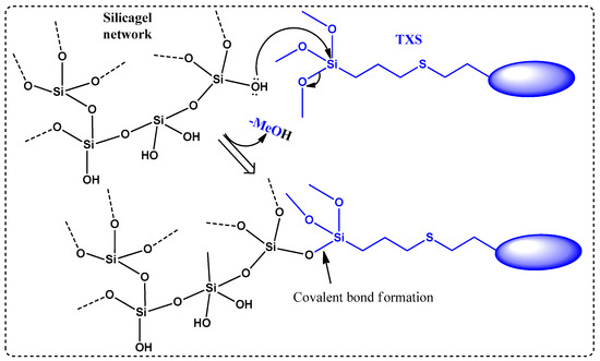 Covalent bond formation between siloxane network and TXS via nucleophilic substitution.