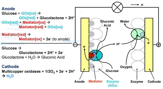 Biofuel cells work and are similar to traditional fuel cells, with two electrodes (anode and cathode), at least one of which contains a biocatalyst in the form of enzymes or microorganisms that use common organic compounds as fuel [28,29], as shown in Figure 1. The difference is that biocatalysts replace expensive metal catalysts and use organic compounds as fuel to perform oxidation reactions on the anode and release electrons [30]. Taking the glucose/O2 biofuel cell as an example, the overall and electrode reactions are as follows: