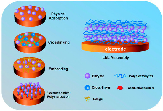 Enzyme immobilization strategy in enzymatic biofuel cells. Reprinted/adapted with permission from Ref. [53]. 2020, Royal Society of Chemistry.