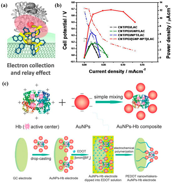 Oxide and metal nanomaterials have been extensively studied in biofuel cell design due to their unique physical and chemical properties. For example, Au, Ag, and Pt nanoparticles and some functional oxide nanoparticles (such as Fe2O3, Al2O3, ZnO, and TiO2) are used in biofuel cells or biocatalysis due to their high thermal stability, excellent electron transfer performance, and high catalytic performance [83,84,85]. Various metal nanoparticles such as AuNPs, AgNPs, PtNPs, etc., have been used to modify the electrodes of EBFCs to promote electron transfer between the enzyme and the substrate electrode [50,86]. In some cases, AuNPs are modified on surfaces such as carbon nanotubes, graphene, or conductive polymers. The enzyme is immobilized on the substrate electrode through the formation of a chemical bond through a chemical reaction between the end group of the enzyme and the groups on the pretreated AuNPs [87,88]. Electron transfer is facilitated by reducing the distance between the enzyme and the substrate electrode. Suhyeon et al. [89] artificially improved the performance of a laccase-based cathode EBFC and prepared an electrode composed of AuNPs wrapped with laccase, CNTs, polyethylenimine (PEI), and 2-naphthalenethiol (NPT). Among them, PEI immobilizes laccase through electrostatic adsorption. Pt/C was used as the anode, and glucose aqueous solution was used as the electrolyte (40 mmol/L), as shown in Figure 4a. The maximum power density of this EBFC is 13 μW/cm2, which is significantly better than the electrode without AuNPs (7 μW/cm2), as shown in Figure 4b. This shows that the gold–sulfhydryl bond can promote electron transfer between the CNT/PEI substrate and laccase, greatly improving the oxygen reduction rate and EBFC power density of the laccase cathode.