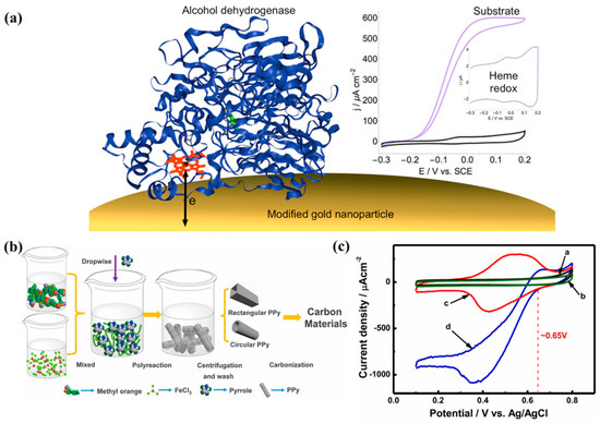 In order to realize direct electron transfer on the bioanode of alcohol dehydrogenase, Ratautas et al. [90] prepared a bioanode composed of alcohol dehydrogenase, AuNPs, and 4-aminothiophenol. AuNPs are prepared by reducing HAuCl4 with sodium citrate and then drop-coated onto a gold-based electrode. 4-aminothiophenol modifies alcohol dehydrogenase on the AuNPs through gold–sulfur bonds and covalent bonds, as shown in Figure 4c. The electrode was used to catalyze glycerol, and electrochemical tests were performed, showing that the bioanode produced a current density of 510 μA/cm2 at pH = 7.0 and 0 V/SCE. This is mainly because AuNPs promote electron transfer between the redox center of alcohol dehydrogenase and 4-aminothiophenol-modified AuNPs.