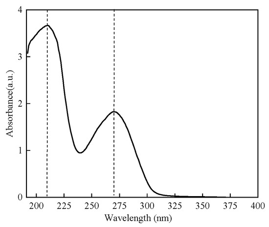 Crude protamine was extracted from the sperm of T. flavidus via a UV absorption spectrum, and the results are shown in Figure 1. The spectrum revealed two absorption peaks around 215 nm and 270 nm, with the peak near 215 nm being the highest: this could be attributed to the stronger ultraviolet absorption of peptide bonds in crude proteins compared to aromatic amino acids [36]. Additionally, the crude protamine contained a significant amount of phenylalanine and tyrosine (as shown in Table 2), both of which had conjugated double bonds and exhibited absorption properties within the ultraviolet range [37]. Therefore, a detection wavelength of 215 nm would be chosen for subsequent purification experiments.