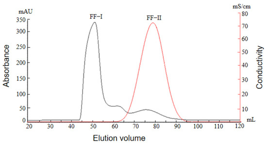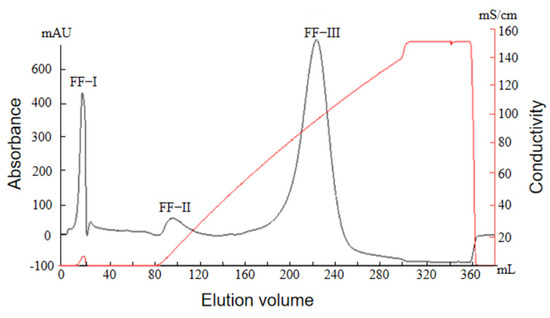 Protamine is essentially a kind of alkaline polycationic peptide. Therefore, the peak S-I purified via sephadex G50 gel chromatography was further purified via cation-exchange chromatography–hydroxymethyl agarose gel FF ion exchange chromatography (CM Sepharose Fast Flow); the results are shown in Figure 3. From the graph, it can be observed that three peaks, namely FF-I, FF-II, and FF-III, are separated via linear elution with a 0.2–1.8 mol/L NaCl buffer after separation via hydroxymethyl agarose gel chromatography. Because the peak FF-I is observed at 0~80 mL, this indicates that it was not adsorbed in the column, and it is considered a penetration peak. While the Sakaguchi reaction and antibacterial activity of peaks FF-II and FF-III were tested, respectively, it was observed that peak FF-II exhibited a weak Sakaguchi reaction, but no antibacterial activity and peak F-III exhibited a significant Sakaguchi reaction and good antibacterial activity (as shown in Table 4). Therefore, peak FF-III was selected as the target protein peak for collection.