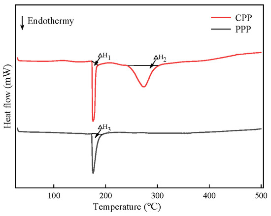 Figure 6 shows the DSC of the CPP and PPP of T. flavidus within the temperature range of 40~500 °C. From the graph, it could be observed that CPP exhibited two denaturation peaks at 176 °C and 274 °C, with denaturation enthalpies of ΔH1: 73.92 J/g and ΔH2: 318.81 J/g, respectively, while PPP exhibited only one denaturation peak at 176 °C, with a denaturation enthalpy value of △H3:192.19 J/g. This indicated that the peak at 176 °C was the endothermic peak of the protamine of T. flavidus, while the peak at 274 °C was a result of impurities. The protamine of T. flavidus exhibited high denaturation temperatures, which were significantly higher than the denaturation temperatures of some common heat-resistant proteins, such as lactoferrin (70–75 °C) and whey protein (76–82 °C) [57]. It belonged to a highly thermally stable protein. Compared to CPP, the phase transition temperature of PPP did not change significantly, but the denaturation enthalpy value increased, indicating a lower number of impurities and improved thermal stability in PPP. There were many factors affecting the thermal stability of proteins, including amino acid composition, temperature, dipeptide composition, etc. [58]. The thermal stability of heat-resistant proteins was likely influenced by multiple factors. The high denaturation temperature of protamine may be attributed to its high content of arginine [35]. Arginine side chains contained fewer methyl groups and possessed multiple non-covalent bonds, such as ionic bonds and intermolecular forces [59]. The guanidine portion could reduce the activation energy of the chemical reactions and provide a larger surface area for charge interactions, resulting in arginine’s higher dissociation constant (pKa) and resonance stability [59]. It was also observed that heat-resistant proteins contained more hydrophobic and charged amino acids than mesophilic proteins [60]. According to the data in Table 5, the proportions of hydrophobic and charged amino acids in PPP were 30.34% and 65.45%, respectively, which may also contribute to the high thermal stability.