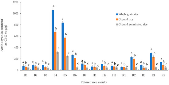 Anthocyanin content of colored rice samples; B1 = black glutinous rice (SE LA BHORN, local Thai rice) sourced from Nakhon Ratchasima province; B2 = black glutinous rice sourced from Nakhon Ratchasima province; B3 = black glutinous rice sourced from Nan province; B4, B5 = black glutinous rice sourced from Phong and Jung districts, respectively, Phayao province; B6 = black glutinous rice sourced from Phrae province; B7 = black glutinous rice sourced from Udonthani province; H1–H3 = hom nil rice sourced from Udonthani, Phitsanulok and Surin provinces, respectively; R1–R5 = riceberry rice sourced from Chaing Rai, Nakhon Ratchasima, Phatthalung, Phrae and Surin province, respectively; Data are presented as mean value ± SD; N = 3. Different lowercase letters (a, b, c) indicate significant differences between the mean values of anthocyanin from different colored rice samples (p < 0.05).