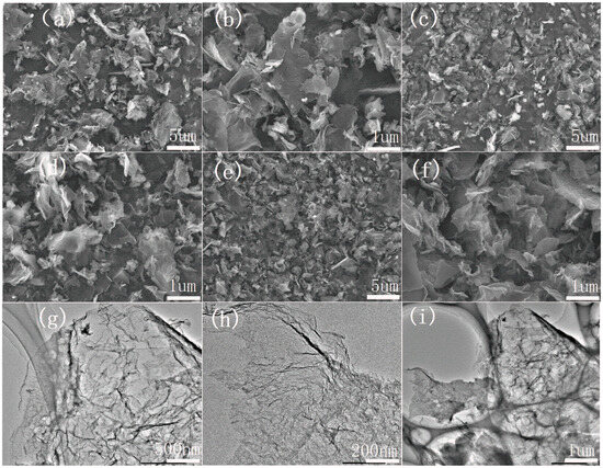 SEM images of K-300-900 (a,b), K180M-900 (c,d), and K180M-300-900 (e,f). TEM image of K180M-300-900 (g–i).