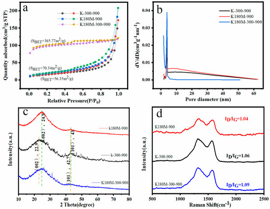 N2 adsorption–desorption curve (a), pore size distribution curve (b), XRD pattern (c), and Raman spectrum (d) of the specific surface areas of K180M−300−900, K180M−900, and K300−900.