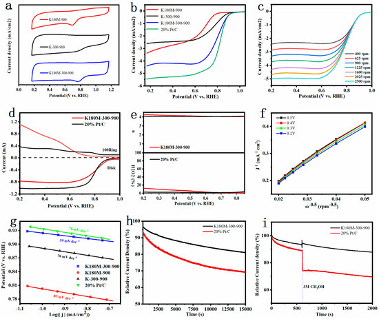 CV curves were obtained when all catalysts were in 0.1 M KOH solution, and were saturated with O₂ in the condition of indoor temperature and scan rate of 50 mV/s (a). LSV of all catalysts were measured at an electrode rotation rate of 1600 rpm and a scan rate of 10 mV/s (b). LSV curves of K180M−300−900 were obtained at different rotation rates from 400 to 2500 rpm (c). The measured RRDE linear scanning voltammogram (d) was obtained at an electrode rotation rate of 1600 rpm and a scan rate of 5 mV/s. Electron transfer number n and H2O2 yield were calculated from K180M−300−900 and 20% Pt/C RRDE measurements (e). K180M−300−900 K—L diagram (f) was calculated according to different speeds and Tafel plot of all catalysts (g). Stability curves for K180M−300−900 and 20% Pt/C in O2-saturated 0.1 M KOH solution (h) and durability test for methanol (i) were obtained.