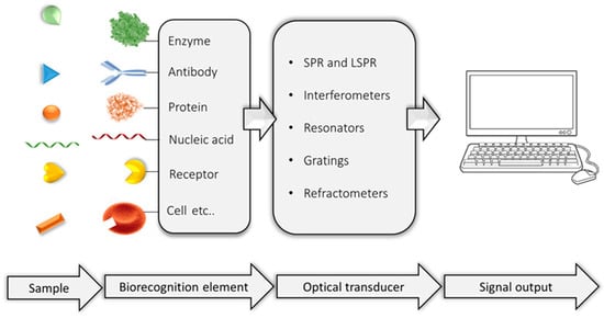 Optical biosensors are classified as follows: surface plasmon resonance biosensors (SPR): a biosensor that emits polarized light at a specific angle of view onto the surface of a metal (or other conductive substance), generating an SPR effect. The SPR phenomenon allows the refractive index of the sensor surface to change directly, label-free, and in real time, in proportion to the concentration of biomolecules []. Localized surface plasmon (LSP)-based biosensors: when the SP is contained in nanoparticles (NP) of size comparable to the incident wavelength and the free electrons of the particles experience collective oscillations, the resulting effect is known as LSP. The LSP is a nonpropagating SP that is concentrated in a small area close to the particle surface, and the size, shape, and composition of the particle can alter its resonance []. PC-based biosensors (PC-based biosensors): a PC is made up of two or more materials with different refractive indices that are organized in space on a regular basis and manipulate light throughout a wide range of optical wavelengths []. Photons, like electrons, can be thought of as having a band structure in PC structures. Optical-fiber-based biosensors: optical fibers are made up of a core and a cladding that has a refractive index slightly higher than the cladding to direct incident light. To protect the fiber, an extra layer is added as a secondary cladding []. Light propagates via an optical cable according to Snell’s law of reflection. As a result, optical fibers are frequently referred to as ‘optical waveguides’. Because of its resistance to external electromagnetic interference and capacity to live in severe settings and extreme temperatures, fiber-optic sensors have received a lot of interest in several analytical domains.