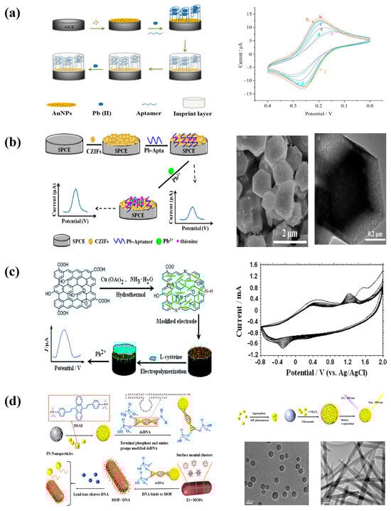 (a) Schematic diagram of aptamer-IIP-Pb(II) preparation for detection of Pb(II), typical CV curves of bare GCE, AuNPs/GCE, aptamer/AuNPs/GCE, aptamer/MCH/AuNPs/GCE and Pb(II)/Aptamer/MCH/AuNPs/GCE []. Reprinted with permission []. Copyright 2022, Molecules. (b) Presentation diagram of the preparation process for the aptasensor and Pb2+ detection, SEM image and TEM image of ZIF-8@ZIF-67 []. Reprinted with permission []. Copyright 2020, Biosensors. (c) The constructing process of the L-Cys/NN-CuO/N-rGO-modified electrode, electro-polymerized process of L-cysteine on the prepared NN-CuO/N-rGO/CPE by cyclic voltammetry for 10 cycles at the scan rate of 0.1 mV s−1 []. Reprinted with permission []. Copyright 2020, RSC advances. (d) Schematic diagram of AIEgen nanosphere-labeled aptamer combined with Zr-MOFs for detection of Pb2+, TEM image of AIEgen NPs and TEM image of MOF []. Reprinted with permission []. Copyright 20202, Biosensors.
