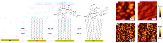 The fabrication steps of the sensing platform. Step i, self-assembly of HDT monolayer. Step ii, intercalation of Dd-OT molecule in the HDT SAM. Step iii, OT-Zn2+ complexation. Influence of zinc ion binding on the morphology and the stiffening of the layer: AFM topography analysis of HDT-Dd-OT (Ra = 1.05 ± 0.09 nm), HDT-Dd-OT-Zn2+ (Ra = 0.52 ± 0.05 nm), and slope of force–distance images of HDT-Dd-OT and HDT-Dd-OT-Zn2+ []. Reprinted with permission []. Copyright 2021, Scientific Reports.