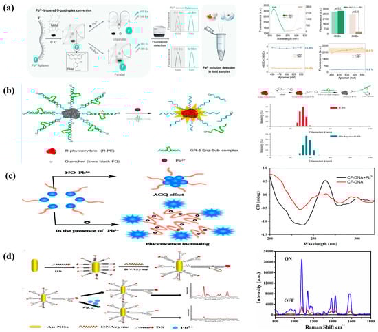 (a) Working principle of the aptasensor and its application for Pb2+ pollution detection. Fluorescent spectra of the aptasensor. Robustness of the G-quadruplex probes. Corresponding fluorescent intensity []. Reprinted with permission []. Copyright 2021, Biosensors. (b) The sensing strategy of DNAzyme-R-PE for Pb2+ detection. The reaction process of the preparation of DNAzyme-R-PE. Dynamic light scattering (DLS) spectra of R-PE and DNAzyme-R-PE []. Reprinted with permission []. Copyright 2019, Sensors. (c) Schematic illustration of analytical method for detecting Pb2+ by utilizing the CF-DNA probe. Circular dichroism spectra of CF-DNA (5 mM) in the absence and presence of Pb2+ (5 mM) []. Reprinted with permission []. Copyright 2018, RSC advances. (d) Fabrication of the DNAzyme-embedded gold nanorods. The principle of the SERS detection for lead ions via DNAzyme SERS biosensor. SERS platform in the state of ‘on’ (blue curve) and ‘off’ (red curve), and SERS spectra of AuNRs (black curve) []. Reprinted with permission []. Copyright 2019, Analytica Chimica Acta: X.