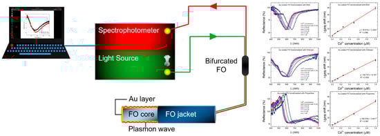 Schematic diagram of the portable FO-SPR sensing system. SPR spectra for varying concentrations from 0 to 1 μM of Cd2+ using BSA, chitosan, and PANI/Au-coated FO-SPR sensors. Corresponding calibration curves of the FO-SPR sensors []. Reprinted with permission []. Copyright 2022, Biosensors.