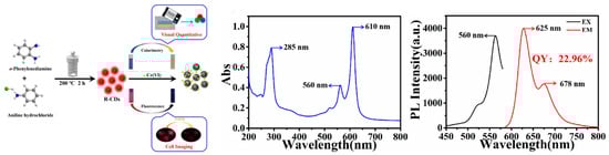 - Hu, J.; Wang, X.; Wei, H.; Zhao, L.; Yao, B.; Zhang, C.; Zhou, J.; Liu, J.; Yang, S. Solid-Phase Synthesis of Red Fluorescent Carbon Dots for the Dual-Mode Detection of Hexavalent Chromium and Cell Imaging. Biosensors 2022, 12, 432. [Google Scholar] [CrossRef] [PubMed]