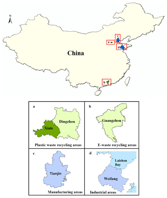 HBCD in soil mainly comes from the local discharge of industrial wastewater and waste and/or deposition of atmospheric pollution from HBCD-related industrial processes. Generally, high concentrations of HBCD were found in soils near HBCD manufacturing plants, followed by soils near plants producing HBCD-related products (Figure 2) [26,27,29,30]. For example, the highest HBCD concentration measured in China (11,700 ng/g) was found in soil near one of the biggest HBCD manufacturing facilities in China [29]. Similarly, HBCD at concentrations of up to 6901 ng/g was detected in soil near HBCD manufacturing facilities in Laizhou Bay, East China [30]. However, the concentrations of HBCD detected in soil near the HBCD-related production and processing plants in Tianjin (1730 ng/g) and Weifang (560.4 ng/g) were lower compared to the above-mentioned areas [8,26]. Additionally, HBCD-related product wastes, including plastic waste, e-waste, and textiles, are also sources of HBCD pollution in the environment. For example, high concentrations of HBCD in soil samples near plastic-waste-treatment sites (11.0–624 ng/g) were detected in Dingzhou and Xinle [31]. Recycled plastic waste consisted mainly of EPX and XPS. E-waste and textile also contributed to increased HBCD concentrations in the environment; although, the amount of HBCD used in textiles and electrical/electronic equipment was relatively small. For example, HBCD concentrations in soils near the e-waste-recycling areas in Guangzhou were at moderate levels (0.38–284 ng/g), which was consistent with the level of HBCD detected in soil in Ningbo (below detection limits-102.6 ng/g), where the textile and electronic equipment industries are well developed.