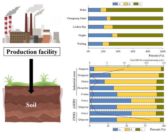 γ-HBCD usually shared the major proportion to the total HBCD in the soil, while certain cases revealed a relatively high proportion of α-HBCD (Figure 3). The composition of HBCD diastereoisomer in soils was strongly influenced by industrial emissions. For example, the diastereoisomer composition of HBCD in soils from the HBCD production facility area in China was found to be consistent with commercial HBCD products. Commercial HBCD consists mainly of 70–89% γ-HBCD, 10–13% α-HBCD, and 1–12% β-HBCD. The proportions to the total HBCD of γ-HBCD, α-HBCD, and β-HBCD were 76 ± 10%, 16 ± 8%, and 8 ± 6% in the soil near the largest HBCD manufacturer in China [29]. γ-HBCD was predominant (averaged 73.9%) in the brominated flame retardant’s production area in Shouguang, followed by α-HBCD (averaged 16.2%) and β-HBCD (averaged 9.9%) [6]. Similar patterns were also observed in soil samples collected from Laizhou Bay and Weifang [8,30]. And, in Guiyu, α-HBCD was the dominant isomer in soils from e-waste-recycling areas, accounting for 56–57% [34], which is similar to the profiles reported for soils near plastics’ industrial parks in Cangzhou (α-HBCD: 42.8–81.1%) [6]. The isomer pattern in HBCD-containing products and environment media can be changed by industrial processes, particularly extrusion molding and thermal cutting, before emission because of differences in the physical properties of the three isomers [6,29,34]. Lower γ-HBCD proportion (55.5%) was found in polystyrene hard plastics consumer products (general purpose polystyrene, high-impact polystyrene, etc.) with more industrial processing than EPS [35]. And, γ-HBCD was the predominant component of commercial technical HBCD products in EPS raw foam, but α-HBCD was found to be the main congener in particles emitted from thermal cutting of EPS. However, the diastereoisomer composition of HBCD in soils differed between point-source and non-point-source sites. For example, in Shouguang, the HBCD diastereoisomer composition in soils in point-source sites (65.3% γ-HBCD, 23.2% β-HBCD and 11.5% α-HBCD) showed significant differences from that in non-point-source sites (56.4% γ-HBCD, 23.8% α-HBCD and 19.7% β-HBCD) (p < 0.028) [36].