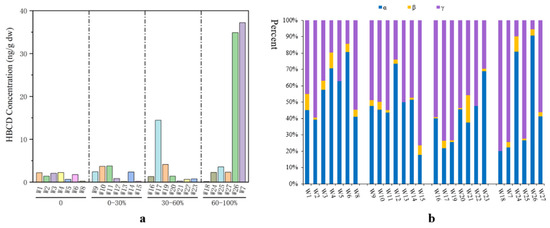 Numerous studies have reported variations in the isomer profiles of sediment samples. Specifically, certain studies have identified elevated concentrations of α-HBCD in sediment samples [62]. The proportions of HBCD isomers in different environmental matrices are potentially affected by thermal isomerization of HBCD-containing products [63], photolysis under natural light [59], and different degradation kinetics under aerobic and anaerobic conditions (α-HBCD slower than β- and γ-HBCD) [64,65].