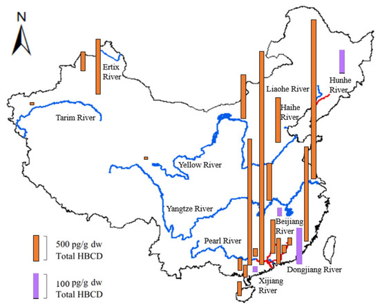 The HBCD concentrations measured in sediment from the seven rivers listed above range from not detected to 206 ng/g [50]. Generally, HBCD concentrations in sediment increased from the North to the Southeast of China (Figure 5). Compared with most other regions in the world, except for Europe and the coast of Korea [55], the Yangtze River had very high HBCD concentrations. The average HBCD concentration in sediments from the Yangtze River drainage basin was as high as 206 ng/g, which was much higher than that from the second-most polluted area, the Pearl River drainage basin (0.03–31.6 ng/g) [46]. HBCD concentrations in sediments from the remaining five rivers (Haihe River, Ertix River, Yellow River, Tarim River, and Liaohe River), which were all located in North China, were all lower than 0.5 ng/g. The HBCD concentrations decreased from the lower reaches to the upper reaches of the rivers. For example, the HBCD concentration in sediments from the upper reaches of the Hunhe River in Northeast China (0.05–1.42 ng/g) is relatively low compared with that from the lower reaches (0.10–25.8 ng/g) [56]. Similar spatial distributions of HBCD have been observed in sediments from the Yangtze River and Pearl River [50].