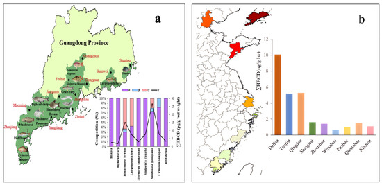 (a) Geographical distribution of HBCD in various types of aquatic biota in Guangdong Province and (b) concentration of HBCD in consumer fish in nine coastal cities (The color depth in the figure represents the concentration of HBCD in consumer fish).