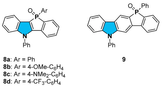 The dibenzo[3,2-b]benzodiphosphole derivative, a higher homolog of benzophosphoro[3,2-b]benzophosphole, was developed [25,26,27]. The higher homolog of BPI, the benzophospholo[3,2-b]carbazole (BPC) derivative, was also synthesized previously via the Suzuki–Miyaura cross-coupling reaction of bromodibenzophosphole with amino-substituted phenylboronic acid, followed by catalytic C–H amination [28]. The substituent on the nitrogen center is a benzyl group, and its photophysical properties were not discussed. Therefore, in order to investigate the effect of direct fusion of pyrrole and phosphole units on photophysical properties, we designed benzophospholo[3,2-b]carbazole 9 with a phenyl group on each nitrogen and phosphorus center.