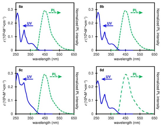 The photophysical properties of BPI 8 were evaluated by ultraviolet-visible (UV)−vis absorption and photoluminescence (PL) spectroscopies. Their spectra are shown in Figure 4, and their photophysical data are summarized in Table 1. Compound 8a showed the longest absorption band with a maximum (λabs) at 355 nm in CHCl3 and 353 nm in CH2Cl2. The spectrum shape is the same as that of its methyl analog 7, while the longest absorption maximum is slightly blue-shifted compared with that of 7 (355 nm in CH2Cl2) [21]. For the PL measurements, the BPI derivative 8a demonstrated the emission maxima (λPL) at 449 nm both in CHCl3 and CH2Cl2. The Stokes shifts of 8a were estimated to be 5900 cm−1 in CHCl3 and 6060 cm−1 in CH2Cl2. The Stokes shift in CH2Cl2 is larger than that of the methyl analog 7 (5950 cm−1). Compounds 8a, 8b, and 8d showed almost identical absorption spectra with the longest absorption maxima at 355–358 nm in CHCl3. On the other hand, compound 8c with a 4-(dimethylamino)phenyl group on the phosphorus center showed less resolved absorption spectrum without a distinct maximum at around 350 nm. The PL spectra of BPIs 8a–8d are almost identical with the emission maxima at around 450 nm. The absolute quantum yields (Φ) of 8a, 8b, and 8d are relatively high ≈ 0.70, while the Φ value of 8c is much smaller (0.50).