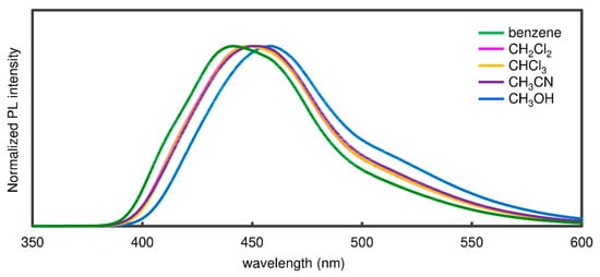 The absorption and emission properties of 8a were also evaluated in different solvents (Table 2). The absorption spectra did not shift significantly in various organic solvents (Figure S22). On the other hand, a solvatochromic shift was observed for the PL spectrum (Figure 5 and Table 1). The emission maximum showed a substantial red-shift with an increase in solvent polarity [23]. The solvatochromic shift of 890 cm−1, which was demonstrated by changing the solvents from the less polar benzene to the highly polar methanol, was larger than that of the BPBF 5 (810 cm−1) [19].