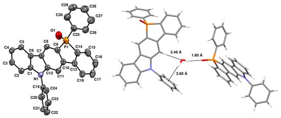 The synthesis of 9 is described in Scheme 2. The reaction of 2,2′-dilithiated biaryls with dichlorophenylphosphine was again applied to construct the dibenzophosphole moiety. The starting material 14 for the dibenzophosphole construction was synthesized using transition-metal-free N-arylation [29] of 3-bromo-2-(2-bromophenyl)carbazole [30] with diphenyliodonium salt. Treatment of 14 with BuLi, the reaction with PhPCl2, and the following oxidation produced the desired compound 9 in 17% yield. The structure of 9 was confirmed using X-ray crystallographic analysis (Figure 7). The π-conjugated core was found to be planar (r.m.s. deviation 0.022 Å), and both enantiomers were contained in a unit cell. The interplane distance between the neighboring molecules is 3.46 Å, indicating the presence of π–π stacking. Water molecules were incorporated in the single crystal and interacted with two BPC molecules via O–H···π(phenyl) (2.60(4) Å) and O–H···O(phosphoryl) (1.80(4) Å) and C–H···O(water) (2.49 Å) hydrogen bonds.