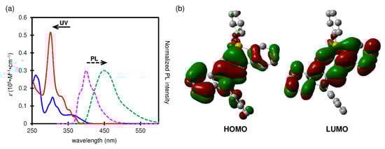 The DFT and TD–DFT calculations were performed using the Gaussian 16 [24] program at the B3LYP/6-31+G(d) level. The starting molecular models for DFT geometry optimizations were built and optimized with MMFF molecular mechanics using the Spartan ’08 package (Wavefunction, Inc., Irvine, CA, USA). Six singlet states were calculated in TD–DFT calculations. The visualization of the molecular orbitals was performed using GaussView 5.