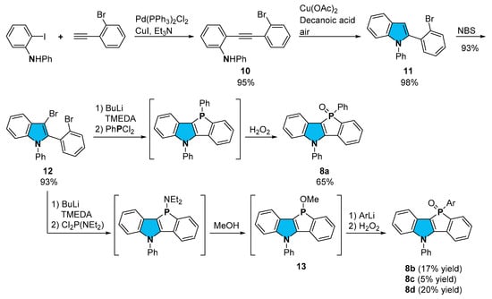 - Matsumura, M.; Yamada, M.; Muranaka, A.; Kanai, M.; Kakusawa, N.; Hashizume, D.; Uchiyama, M.; Yasuike, S. Synthesis and photophysical properties of novel benzophospholo[3,2-b]indole derivatives. Beilstein J. Org. Chem. 2017, 13, 2304–2309. [Google Scholar] [CrossRef] [PubMed]