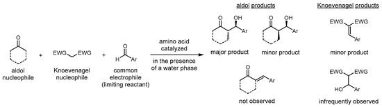 Aldol and Knoevenagel condensation reactions share aldehydes as common electrophiles (Scheme 1). Knoevenagel pronucleophiles, most often methylene units flanked by two electron withdrawing groups (EWG), can be converted to their nucleophilic forms under acidic, neutral, or basic conditions [13,14]. Furthermore, their significantly lower pKa values, as compared to ketones, allow them to chemoselectively undergo Knoevenagel reactions in the presence of ketones [15,16,17]. Further supportive evidence of the greater reactivity of Knoevenagel versus aldol (ketone) nucleophiles comes from the literature reports on the amino acid catalyzed variants. For example, the reaction of cyclohexanone or acetylacetone with benzaldehyde, under similar reaction conditions, always show Knoevenagel [18,19] reactions with significantly higher rates of reaction as compared to the corresponding aldol [20,21,22] reactions.