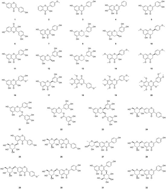 Flavonoids are natural polyphenolic substances and secondary metabolites of plants. They possess remarkable antioxidant activity, which has been extensively investigated. This antioxidant activity aids in the prevention of damage caused by free radicals through scavenging reactive oxygen species (ROS), activating antioxidant enzymes, and inhibiting oxidases. Moreover, flavonoids elevate uric acid levels and exhibit metal-chelating activity to alleviate oxidative stress [28]. Studies have also indicated that flavonoids activate antioxidant pathways, thereby contributing to their anti-inflammatory effects. They inhibit the secretion of enzymes such as lysozymes and β-glucuronidase, as well as the secretion of arachidonic acid, thus reducing inflammatory reactions. Flavonoids such as apigenin (3), kaempferol (7), and (−)-epigallocatechin 3-O-gallate (22) play a role in modulating the expression and activation of various cytokines, including interleukin-1beta (IL-1β), tumor necrosis factor-alpha (TNF-α), interleukin-6 (IL-6), and interleukin-8 (IL-8). They also regulate the gene expression of several pro-inflammatory molecules, such as nuclear factor-kappaB (NF-κB), activator protein-1 (AP-1), and intercellular adhesion molecule-1 (ICAM). Additionally, they inhibit pro-inflammatory enzymes such as inducible nitric oxide (NO) synthase, cyclooxygenase-2, and lipoxygenase [29].