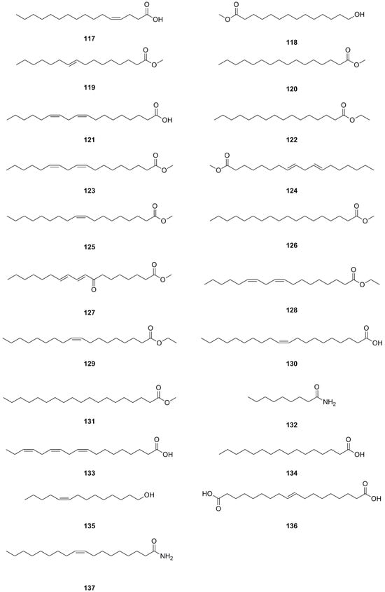 A total of forty-five fatty acids and their derivatives were isolated and identified from various parts of L. bulbifera, including the roots, aerial parts, and the whole herb (Table 8, Figure 10). These include saturated and unsaturated fatty acids, hydroxy fatty acids, amino fatty acids, fatty esters, and fatty amides. Fatty acids have shown potential in treating metabolic diseases such as type II diabetes, inflammatory diseases, and cancer [39,40]. Intake of linoleic acid (121) has been found to improve hyperlipidemia and reduce the incidence of type II diabetes [41]. Linolenic acid (133) possesses anti-metabolic syndrome, anticancer, anti-inflammatory, and antioxidant properties [42].