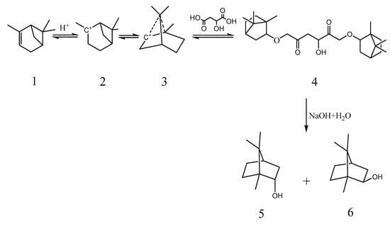- Meng, Z.L.; Qin, R.X.; Wen, R.S.; Li, G.Q.; Liang, Z.Y.; Xie, J.K.; Zhou, Y.H.; Yang, Z.Q. Studyon Synthesizing Isobornyl Acetate/Isoborneol from Camphene Using α-Hydroxyl Carboxylic Acid Composite Catalyst. Molecules 2023, 28, 1875. [Google Scholar] [CrossRef] [PubMed]